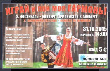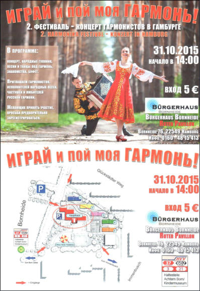 Wer Freude an der russichen Volksmusik hat und gerne zur  Garmoschka singt und tanzt sollte diese Veranstaltung nicht  verpassen. Neben einem umfangreichen Bühnenprogramm sind  Instrumentenaussteller vor Ort und natürlich kommt auch die  traditionelle Küche nicht zu kurz.   Musikhaus Hoppe stellt als Akkordeonspezialist Garmoschka- Instrumente der Firma Barffetti aus. .